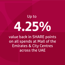 Use SHARE points to pay for purchases and experiences at 3,500 stores in Mall of the Emirates and City Centres across UAE