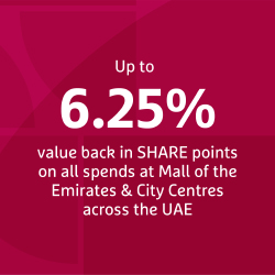Use SHARE points to pay for purchases and experiences at 3,500 stores in Mall of the Emirates and City Centres across UAE